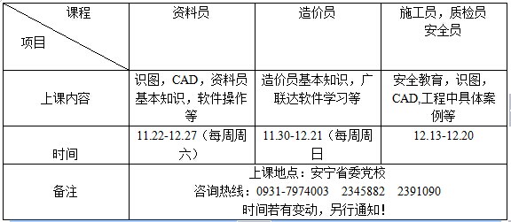 從2014年11月22日開始,公司本著“安全第一,預防為主”的方針,為了讓廣大學員能夠有扎實的理論基礎,我公司教學部安排了資料員,造價員,施工員,質檢員,安全員培訓課程。