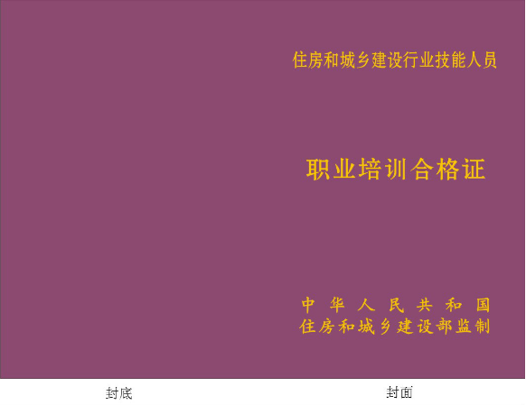 封面:“住房城鄉建設行業技能人員”字樣為宋體、三號、加粗,居中,段前40磅,段后40磅。“職業培訓合格證”字樣為宋體、二號、加粗,居中,段前60磅,段后80磅。“住房和城鄉建設部監制”字樣為宋體、四號、加粗,分散對齊,行距28磅,段前0磅,段后0磅。封面字樣顏色模式均為RGB,紅色245,綠色205,藍色50。
