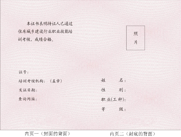 內頁一:“本證書表明持證人已通過住房城鄉建設行業職業技能培訓考核,成績合格。”字樣為楷體、小三、黑色,兩端對齊、首行縮進2字符,段前40磅,段后50磅,固定行距26磅。“證號:”、“培訓考核機構:(蓋章)”、“發證日期”、“查詢網址”字樣均為楷體、四號、黑色,左對齊,段前5磅,段后0磅。