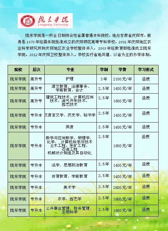 隴東學(xué)院位于甘肅慶陽市。是一所實(shí)行省地共建、以省為主的多科型全日制普通本科院校。學(xué)校是蘭州大學(xué)、華東師范大學(xué)等院校的合作院校,與美國北亞利桑那大學(xué)、洪堡州立大學(xué)、曼斯菲爾德大學(xué)及臺(tái)灣中國文化大學(xué)等13所院校建立了校際合作交流關(guān)系。