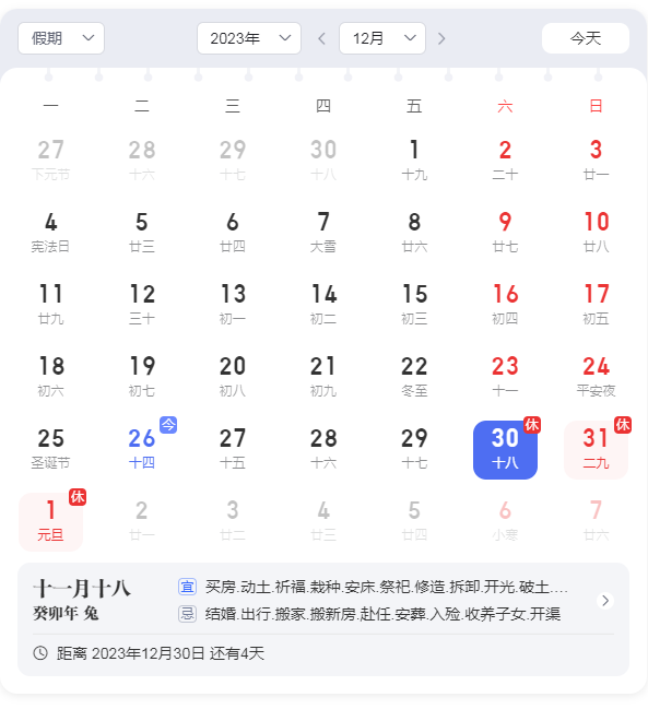 2023年12月30日(星期六)至2024年1月1日(星期一)放假調(diào)休,共3天。2024年1月2日(星期二)上班。提前預(yù)祝各位心想事成,工作順利。元旦快樂!