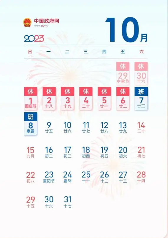 2023年9月29日(星期五)至10月6日(星期五)放假調(diào)休,共8天。10月7日(星期六)、10月8日(星期日)上班。提前預(yù)祝各位中秋國(guó)慶雙節(jié)快樂(lè)!闔家團(tuán)圓!