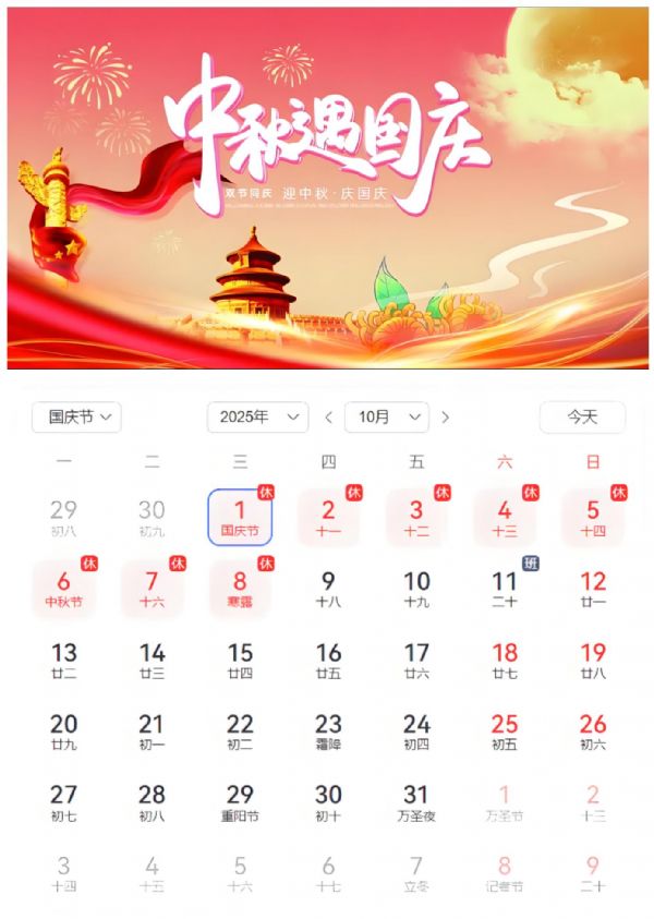 [10月1日-10月8日(放假調休),共八天。10月9日(星期四)正常上班。恭祝朋友們國慶中秋雙節快樂、生活喜樂、闔家幸福!